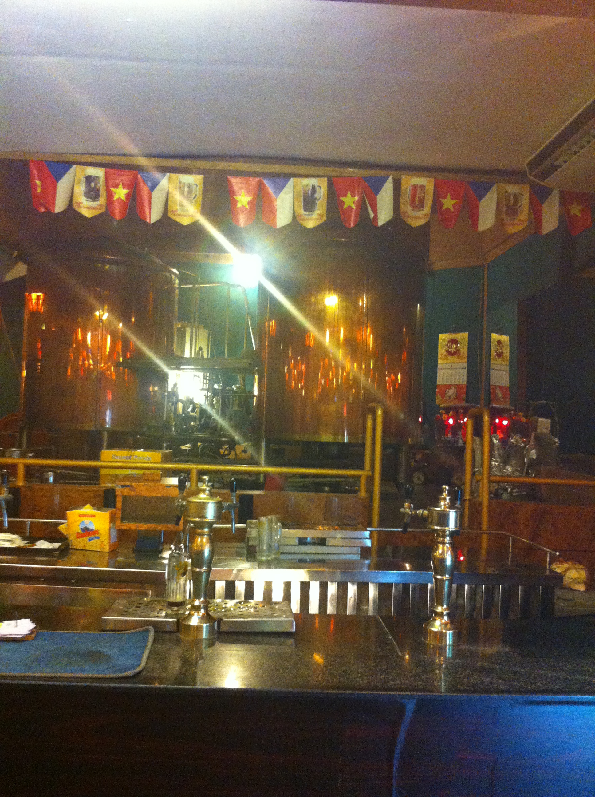 This is one of the few breweries that still has three beers on tap. The style is Czech and you can see some old flags decorating the roof. Before the financial crisis many breweries were crowded and many had three beers on tap. Today most of them have only two and sometimes just one. Lacvieen has place for about 300 people and is decorated with lamps looking like big beer glasses, combined with small lights and dark furniture in a big open indoor space.