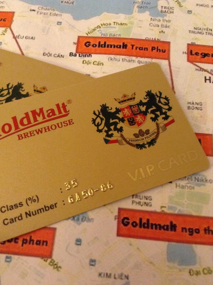 VIP cards to all seven Goldmalts This goldmalt is consistent and here we also met the owner and the man behind Goldmalts brewery equipment, mr Long. Its not easy to get discount cards here in town, so it was a great surprise when Mr Long handed out 11 VIP-cards with 35% discount, valid for all six Goldmalts in Hanoi.