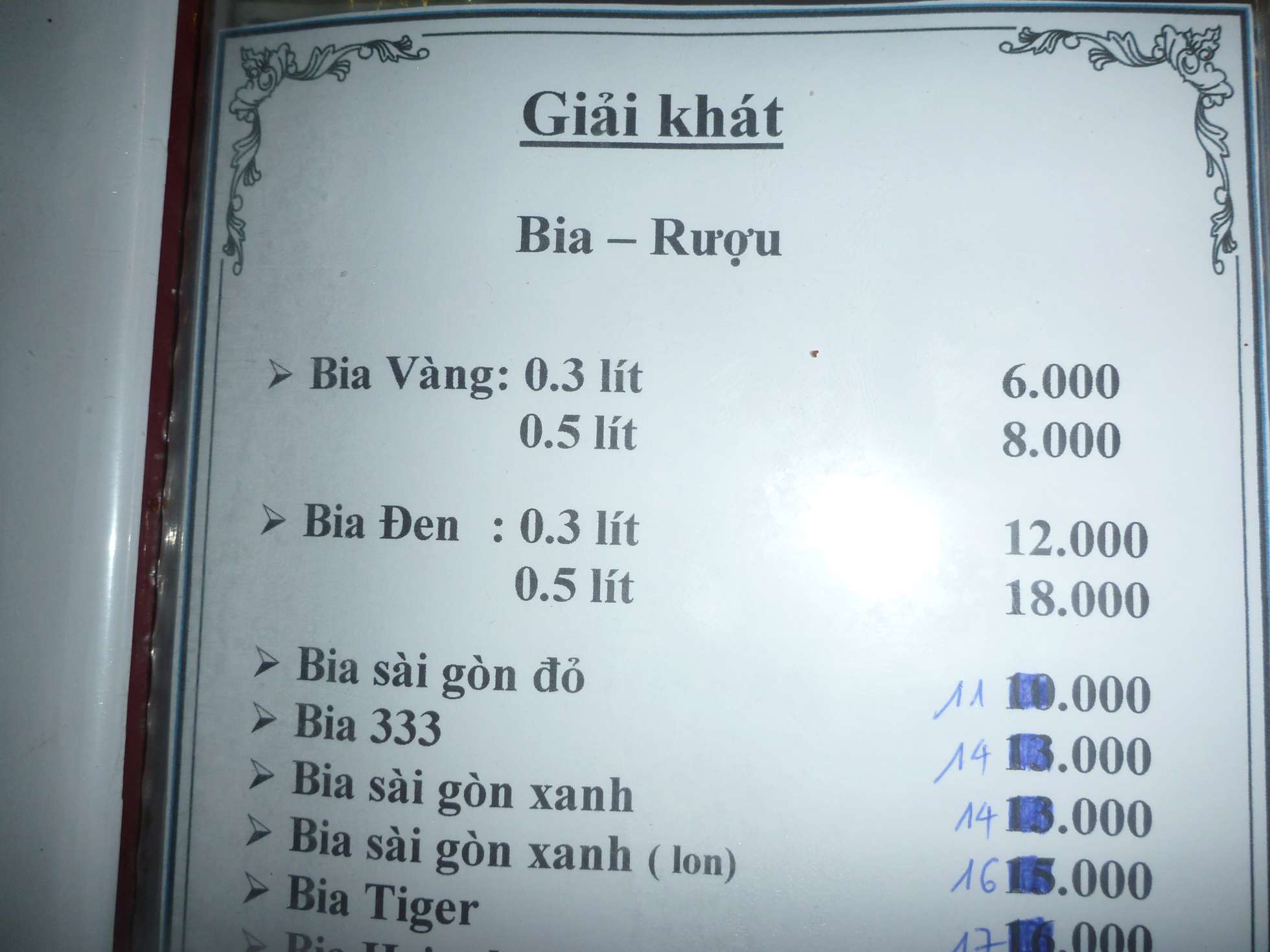 They serve two beers – a gold (vàng) and a dark(đen) – which can be bought in 0.3l or 0.5l.  Its all cheap and way better than a tin of 333.  This is probably the lowest price ever in a Big Man Beer, lower than the price of Bia Hoi. There’s a large food menu, in Vietnamese, though a couple of the staff speak enough English that you can order basic dishes.  A dictionary on your smartphone helps too.